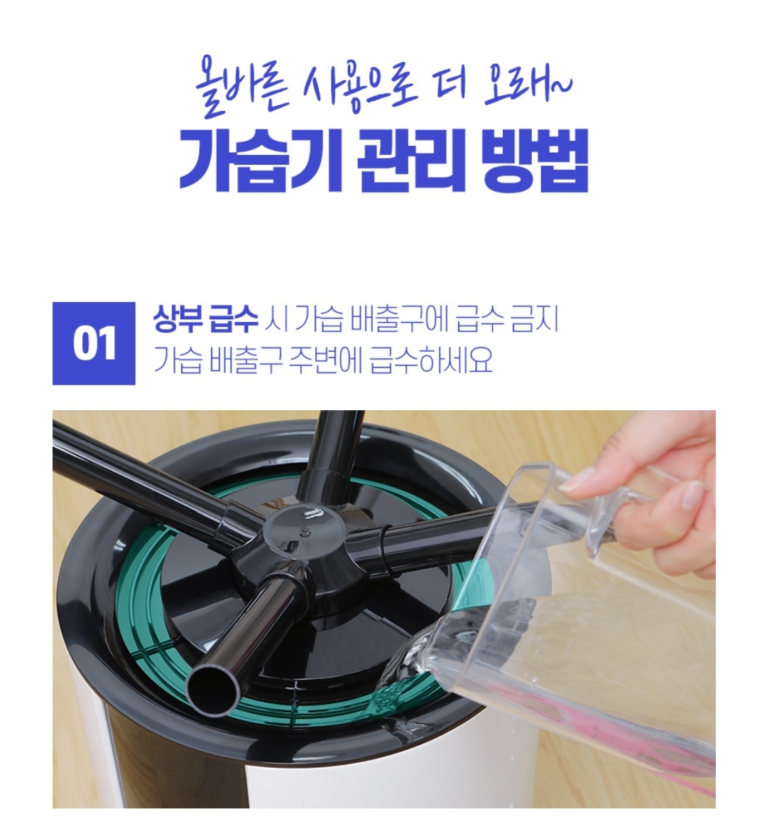 - 상부급수형 디자인: 이 가습기는 상부에서 직접 급수하는 형태로 설계되었습니다. 이를 통해 사용자는 별도의 급수 공간 없이 간단하고 편리하게 물을 추가할 수 있습니다.